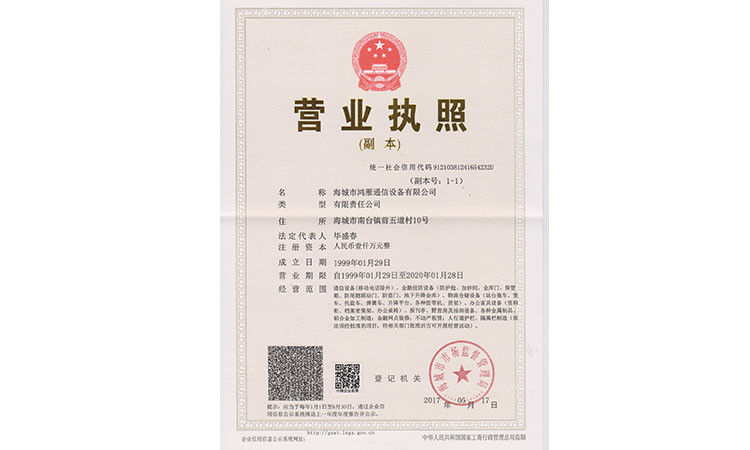 海城市鴻雁通信設備有限公司成立于1985年,位于海城市鞍海公路東側,交通便利。注冊資金1000萬,占地面積17800平方米,職工120人,年產(chǎn)值600多萬。法人代表畢盛春,曾多次獲得“中國誠信企業(yè)家”稱號。